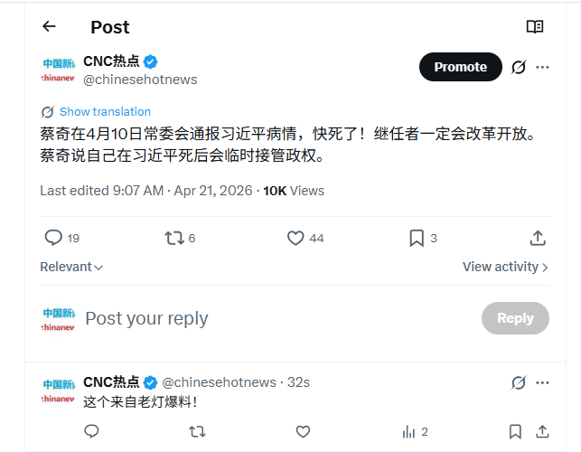 蔡奇说习近平快死了