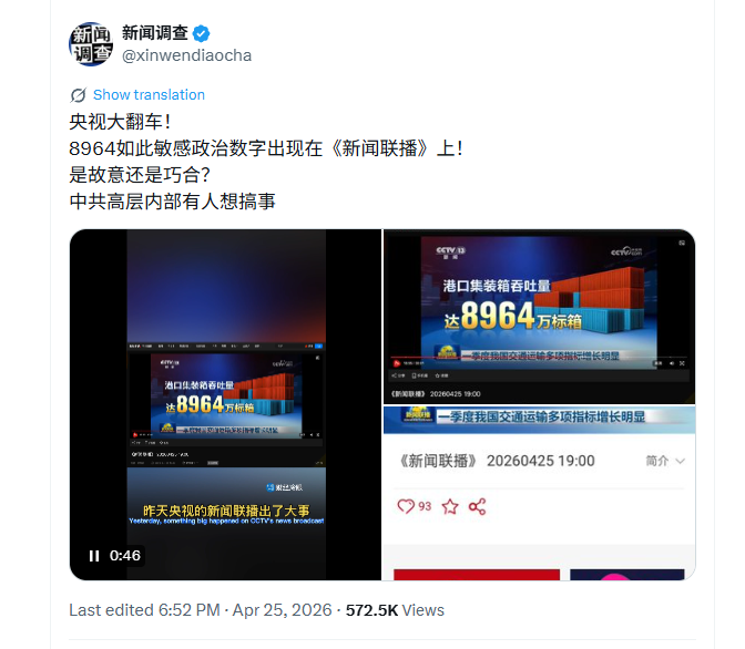 4月25日,央视在报道一季度交通运输数据时,画面清晰显示“港口集装箱吞吐量达8964万标箱”。8964——这个足以惊掉人下巴的最高级别敏感数字,怎就绕过了重重审查机制,堂而皇之地出现在央视新闻联播中呢?是年轻从业者的“无知”,是把关人的疏忽失误,还是有人故意“冲塔”?外界不得而知,但结合中共政权当下的极度动荡的政治生态来审视,这无疑是中南海政权深度裂痕的一则侧影。