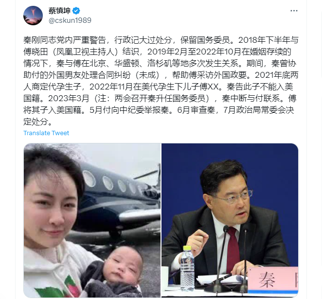 - 个人关系: 2023年,在前中国外交部长秦刚被免职后,傅晓田与秦刚的私人关系成为媒体关注的焦点。多方报道指两人存在婚外情,并于美国通过代孕方式育有一子。